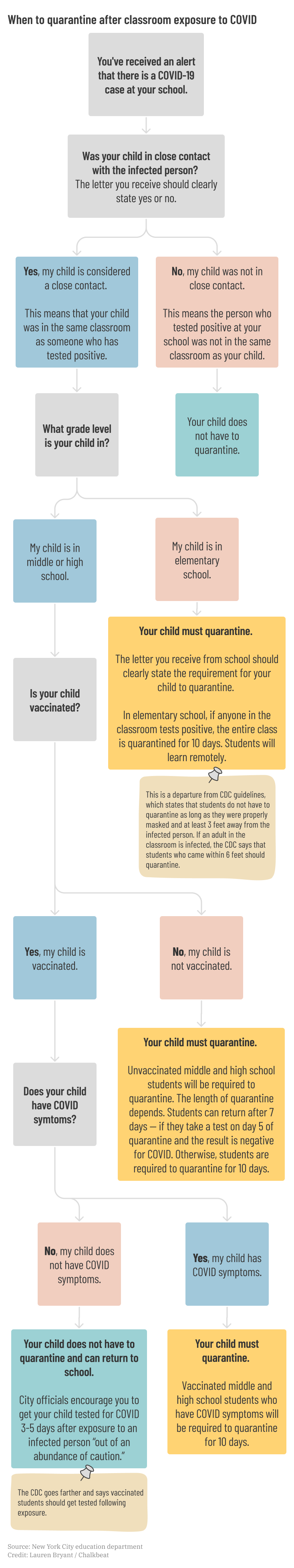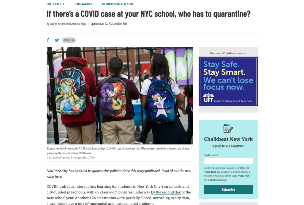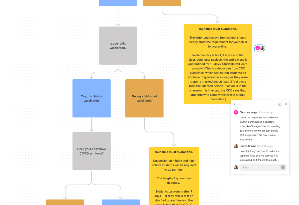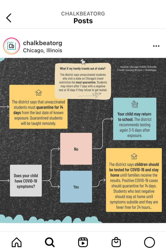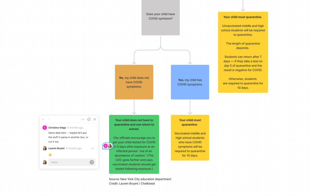 “It’s so confusing to know when people are supposed to quarantine,” a colleague wrote on slack, “it might be helpful to have an explainer… because I really don’t know as a parent.” At the start of the 2021-2022 school year, it seemed as though every school district had its own set of confusing quarantine guidelines. So the editorial staff at Chalkbeat decided to create an easy-to-follow explainer. I worked with reporters and editors to design a simple flowchart that parents could use as a reference. We designed unique flowcharts for three of our bureaus: New York, Chicago, and Detroit.