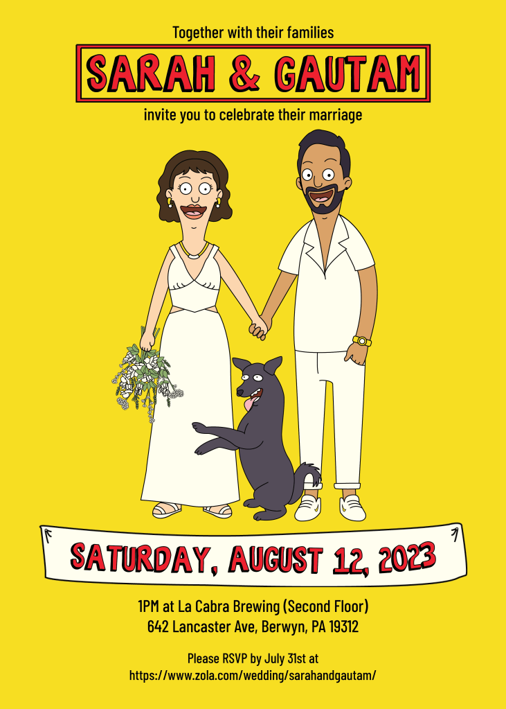 Sarah and Gautam hosted a party at a brewery to celebrate their recent destination wedding. For their invitations they wanted to feature themselves and their beloved dog Goose in the style of their favorite animated TV show – Bob’s Burgers. They were so thrilled with the invitations that Sarah commissioned me to create a comic book panel that captured some of the highlights of their first year as a married couple. She surprised Gautam with the final artwork for their one year anniversary.