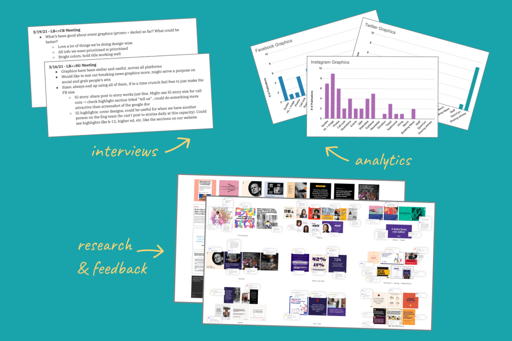 I started by interviewing members of our engagement team about our wants and needs. Next, I reviewed analytics of our social profiles and conducted visual research pulling inspiration from other newsrooms. Then I lead a cross-department discussion and workshop with a visual sorting exercise and listened to feedback about the inspiration imagery.